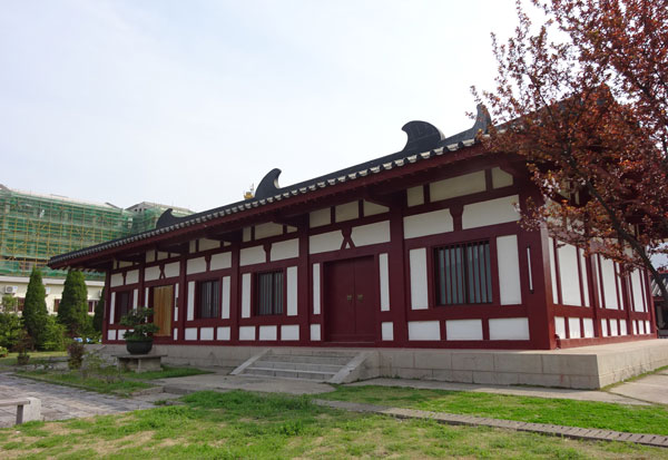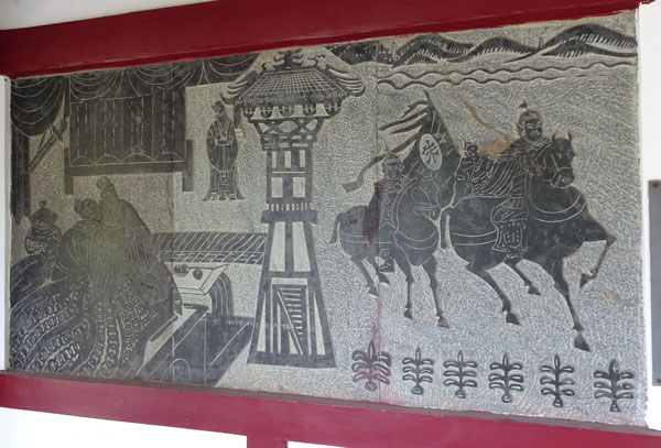 建物を出た先には、写真左手の回廊があります。こちらの回廊の壁面には、朱然の一生を描いたレリーフがずらっと並んでいます。
