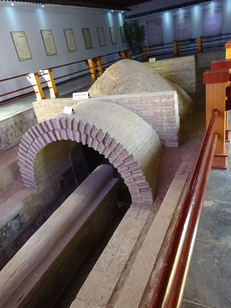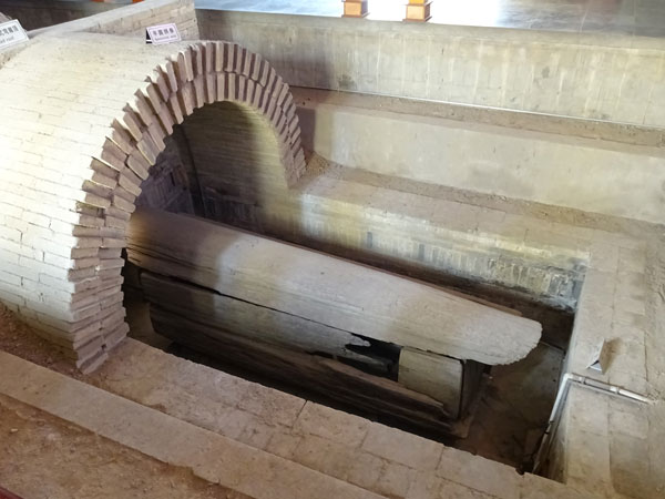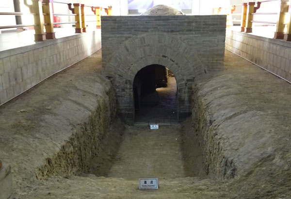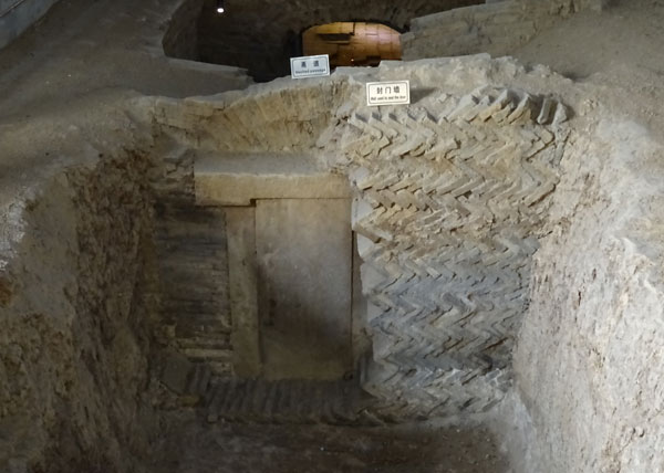 左側が入口のように見えますが、右側にジグザグに積んであるれんが(封門墻)のうしろにも扉があり、二枚の石扉が両開きになるような形になっています。