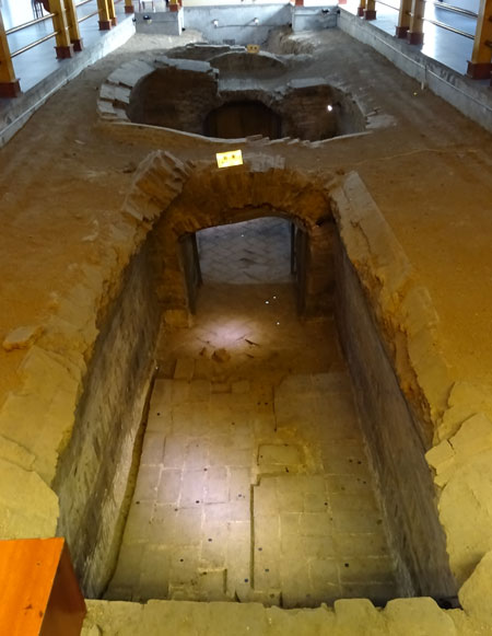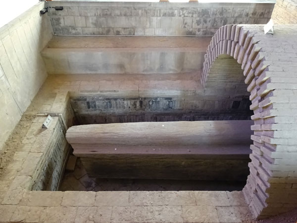 写真手前の空間が後室、その奥が前室、さらに奥が墓道。後室上部にアーチ状の屋根、前室上部にドーム状の屋根があったと考えられていますが、それぞれの屋根の部分は損壊しており、墓室の内部が丸見えの状態になってます。