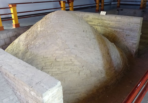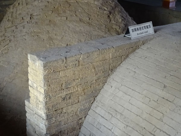 手前の入口通路部分が「甬道」で、そこをくぐった先が前室、さらにその先の入口通路部分が「過道」で、そこをくぐった先が後室です。前室の通路(甬道)は墓の中心線から向かってやや左(西)側に、後室の通路(過道)は向かって右側(東)にかなりずれています。墓の中心線上にないのは、何か意味があるのかなあ?