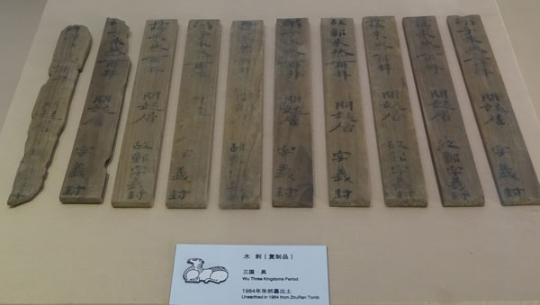 朱然の墓からは、写真のような木刺が14枚、木謁(木刺と長さは同じだが、幅と厚みがある大型のもの)が3枚見つかっているそうです。
