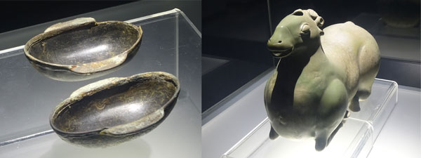 右側は青磁の羊。こちらは朱然の墓ではなく、この後ご紹介する家族墓の方から出たもの。羊は祥に通じ、縁起のいいものだと考えられていたそうです。姿かたちがとても美しく、朱然墓・家族墓のマスコット的存在(?)になってます。